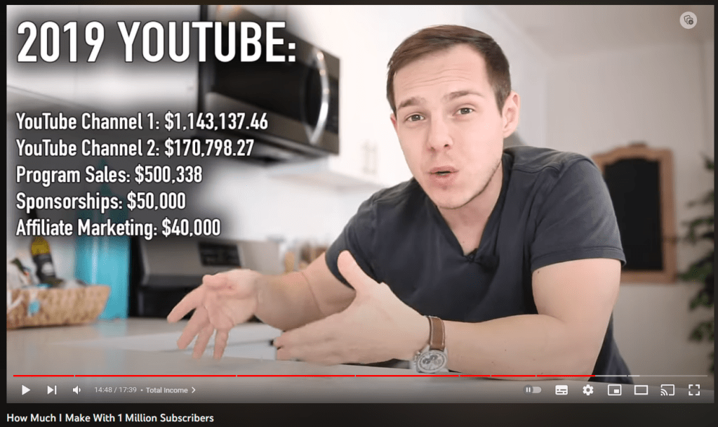 ซึ่งในส่วนนี้ในวิดีโอสรุปรายได้ตอนมีผู้ติดตาม 3 ล้านคน ไม่ได้มีบอกรายละเอียดไว้ ต้องย้อนไปดูของเก่าตอนเขาเพิ่งมีผู้ติดตามล้านเดียวซึ่งโชว์ไว้ค่อนข้างละเอียดตามภาพข้างล่างดังี้ ว่าทั้งปี 2019 เขาทำเงินไปเท่าไหร่